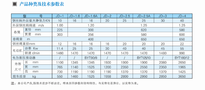 JD-1.6A、JD- 2.5A两个规格的产品,在结构上增加了电力液压推动器作为安全制动,保证绞车使用更为安全可靠。